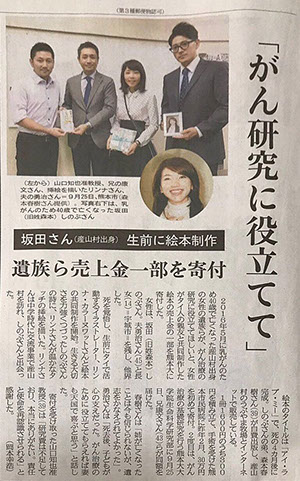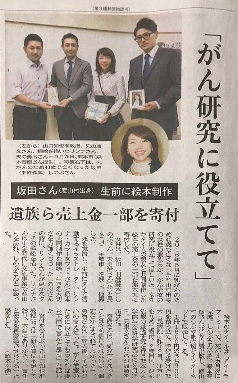 With all the support from everyone, we donated part of the proceeds from the book “I love me” for the second time today. We donated 300,000 JPY to Doctor Yamaguchi, the Cancer Research Representative from Kumamoto University Medical School Hospital as my sister,Shinobu, wished before she passed away.